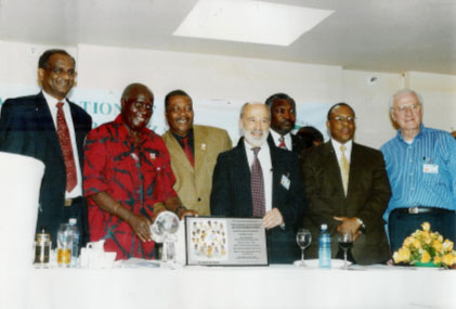 H.E. Dr. Kenneth David Kaunda, first President of the Republic of Zambia, was presented the WANGO Universal Peace Award 2004 at an Award Luncheon during the 3rd International Institute for Peace Through Tourism (IIPT) African Conference, being held at Hotel InterContinental Lusaka in Lusaka, Zambia, on February 5, 2005. H.E. Dr. Kaunda was bestowed the Universal Peace Award, WANGO’s highest award to individuals, because of his remarkable service to humanity, both in politics and in the non-governmental sector.